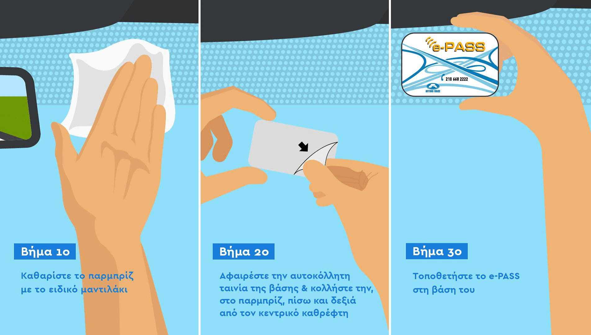 - 3ο βήμα: Κολλήστε με προσοχή τη βάση της ηλεκτρονικής συσκευής στο εσωτερικό του παρμπρίζ και τοποθετήστε το e-PASS στη βάση. Ο οδηγός πρέπει να βλέπει την εικόνα της Αττικής Οδού και το τηλέφωνο επικοινωνίας.