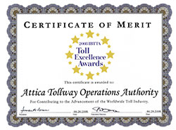 Η «Αττική Οδός Α.Ε.» και η «Αττικές Διαδρομές Α.Ε.» τιμήθηκαν με το 1ο βραβείο «Toll Excellence Award–Administration Category» από το ΙΒΤΤΑ/International Bridge, Tunnel and Turnpike Association (Διεθνής Ένωση Γεφυρών, Σηράγγων) για τη Διαχείριση Έργου. Με το βραβείο «Toll Excellence Award», η «Αττική Οδός Α.Ε.» και η «Αττικές Διαδρομές Α.Ε.» τιμώνται και βραβεύονται για την εφαρμογή του καινοτόμου προγράμματος «Αποτίμηση της Επιτυχίας» (“Monitoring the Success”), που έθεσε σε εφαρμογή η Διοίκηση της εταιρείας για την καταγραφή και συνεχή παρακολούθηση Δεικτών Απόδοσης, με στόχο τη βελτίωση των υπηρεσιών που παρέχονται.