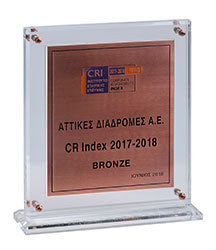 Στο πλαίσιο της 10ης Τελετής Βράβευσης CR Index του Ινστιτούτου Εταιρικής Ευθύνης CRI, η εταιρεία λειτουργίας και συντήρησης της Αττικής Οδού, «Αττικές Διαδρομές Α.Ε.», βραβεύτηκε με το Bronze Award 2017-2018. Το βραβείο αυτό είναι το 3ο που λαμβάνει η εταιρεία, μετά από δύο συνεχείς διακρίσεις CRI Pass που έχουν προηγηθεί. Στην ίδια εκδήλωση, η «Αττικές Διαδρομές Α.Ε.» τιμήθηκε και με «ΕΠΑΙΝΟ ΓΙΑ ΤΗΝ ΑΓΟΡΑ – Marketplace Award».